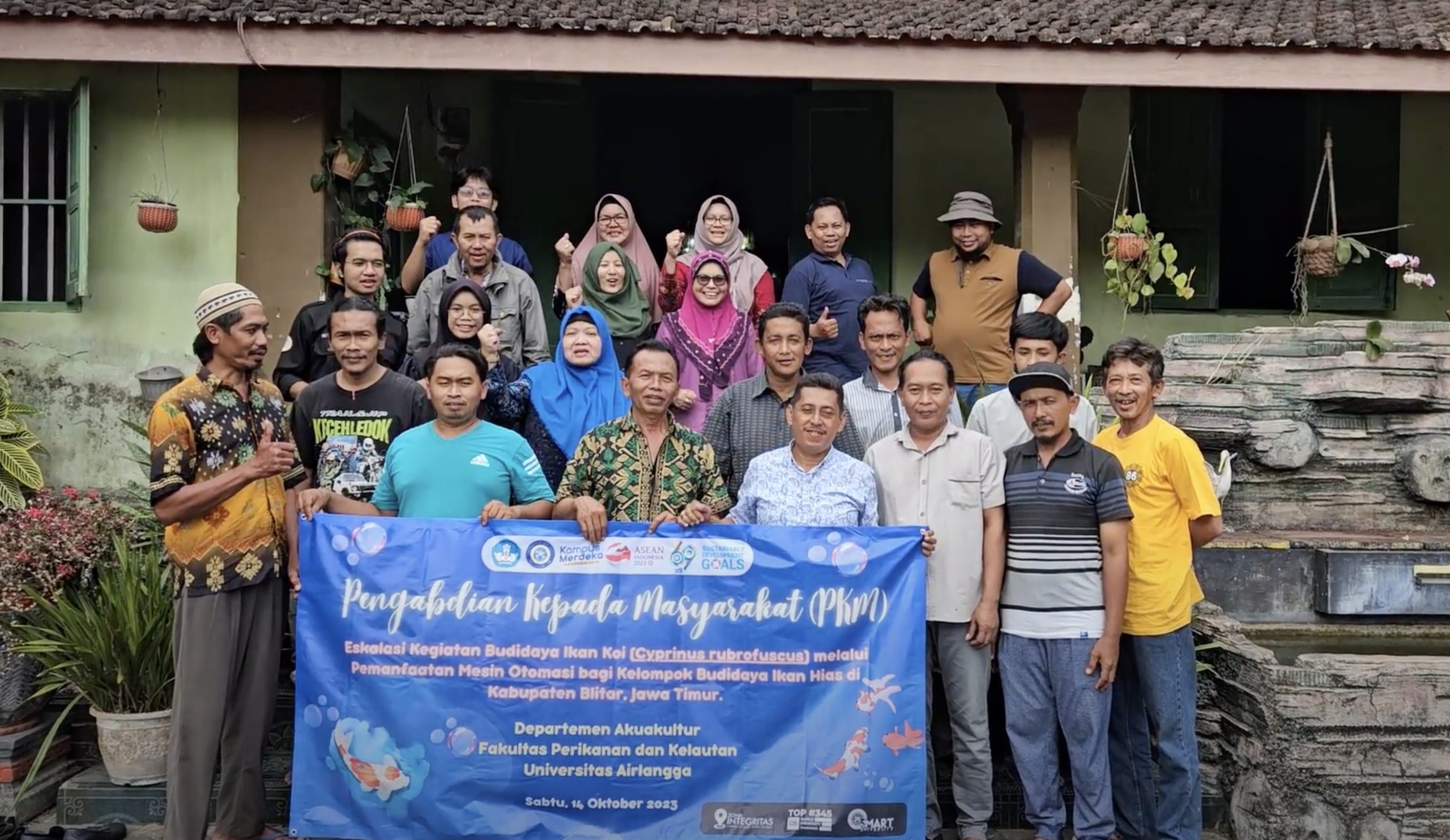 Sambutan hangat dari kelompok budidaya ikan hias di Nglegok, Blitar saat menyambut kedatangan kunjungan tim Pengabdian Kepada Masyarakat (PKM) dari Departemen Akuakultur Fakultas Perikanan dan Kelautan (FPK) Universitas Airlangga (UNAIR). Kegiatan seminar sekaligus diskusi yang dilaksanakan pada 14 Oktober 2023 oleh dosen dan mahasiswa S1 Akuakultur merupakan kegiatan puncak dari serangkaian kegiatan pengabdian yang dilakukan oleh tim pengabdi sejak bulan Mei 2023.